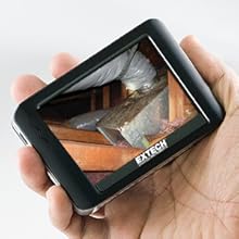 Installation, inspection and diagnostic jobs often require access to hard-to-reach or -see areas. Professionals from a wide range of industries are using Extech's wireless video inspection borescope cameras to access tight spots with the added capability to record 2 GB of video or capture JPEG images. The affordable BR250 is invaluable for simplifying diagnostics and documenting inspections. Unlike other video borescopes on the market, the BR250 expands its versatility with a detachable 3-1/2-Inch color display. Now, users can position the borescope as needed to access a difficult location without losing sight of the display. The monitor can be handheld and kept in direct view or affixed to any metallic surface using its magnet mount). Alternatively, for inspection sites near hazardous or moving components, take the wireless monitor and inspect conditions remotely from over 30 feet (10 meter) away. Captured video (960 x 240 AVI) and images (640 x 480 JPEG) can be viewed on the unit's monitor, or transferred to a computer via the 2GB SD card or USB cable (both included). Additionally, video can be fed to an external monitor using the BR250's video-out jack. The BR250 features a waterproof (IP67-rated) 9 mm diameter camera with a 50 Degree viewing angle and adjustable LED lighting. The camera is mounted to a 39-Inch (1 meter) flexible gooseneck cable which easily retains a fixed shape and up to two optional extension cables (Note: extension cables have a 17 mm diameter) can be added to extend the cable length to 9 feet 7-Inch (2.92 meter). The BR250 comes in a hard carrying case complete with extension attachment tools (45 Degree mirror, hook, and magnet), magnetic base stand, microSD memory card and adaptor, USB and video cables, AC adaptor, rechargeable display battery and 4 AA batteries.